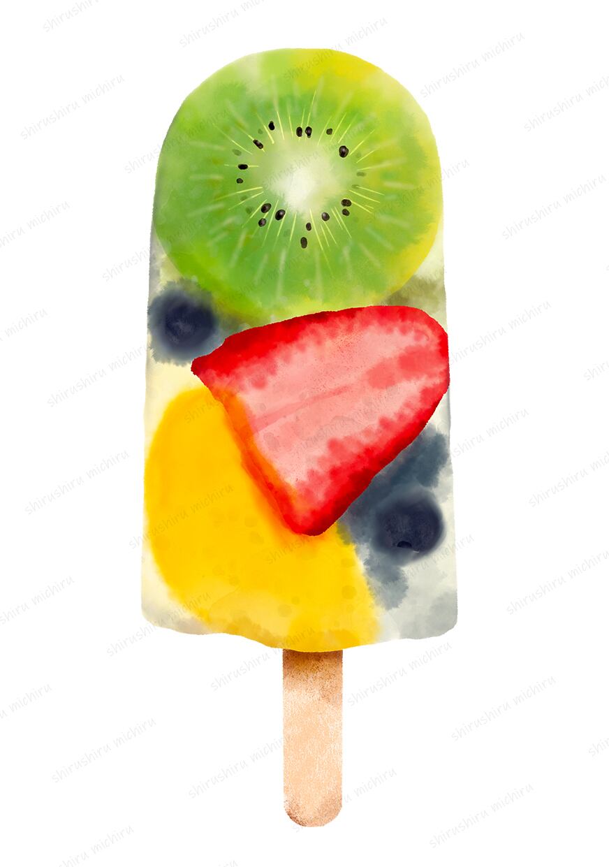 カラフルなフルーツのアイスキャンディーのイラストです。